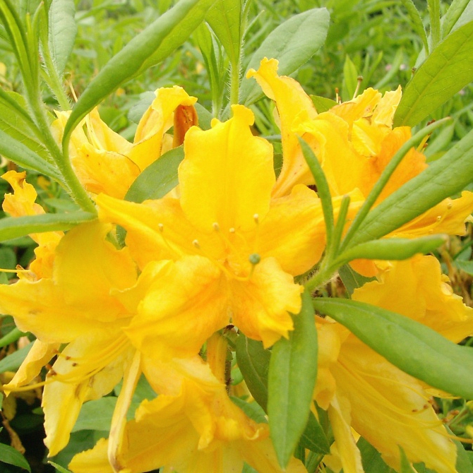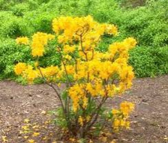 Gelbe Blüten, die sich allmählich orange verfärben, Blätter grün bis dunkelviolett im Herbst.