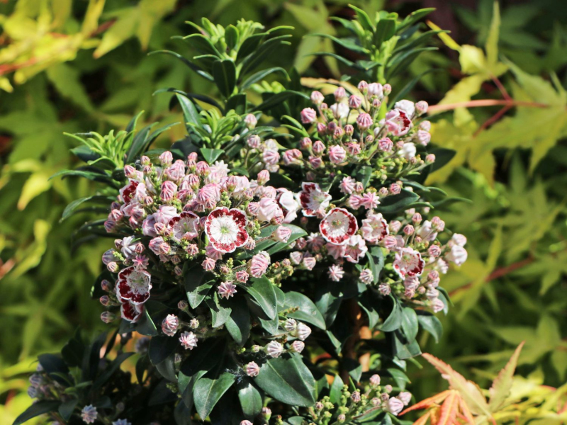 Haben auch Sie eine Schwäche für etwas, das andere wenig oder gar nicht kennen? Wir haben die breitblättrige Calmia unter unsere Fittiche genommen. Dieser Heidestrauch ist einer der schönsten blühenden immergrünen Sträucher unseres Klimas. Er ist im Südosten der USA und in höheren Lagen Asiens beheimatet, wo er als üppiger Unterwuchs höherer Bäume zu finden ist. Es gibt bereits viele Kultivare mit verschiedenen Kombinationen aus roter, weißer, rosa oder weinroter Farbe. Das Beeindruckendste an der Blüte selbst ist jedoch, wenn die Blütenbüschel noch halb in der Knospe stehen, die in der Regel eine andere Farbe als die Blüten selbst hat. Sie blüht gegen Ende Mai bis Juni und verlängert damit die Frühjahrsblüte der Heidebeete mit Rhododendren und Azaleen. Eine immergrüne Calmia mit einzigartigen zimtbraunen fünfblättrigen Blüten.