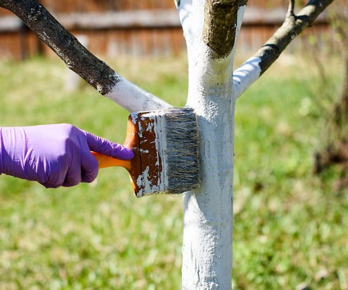 Entfernen Sie die nicht bindenden Teile der Rinde vom Stamm, tragen Sie die Farbe mit einem Pinsel oder einer Rolle auf. Streichen Sie den gesamten Stamm des Baumes bis zu den unteren Ästen. Tragen Sie eine gleichmäßige Menge auf den trockenen Stamm auf. Verwenden Sie saubere Werkzeuge für die Arbeit.