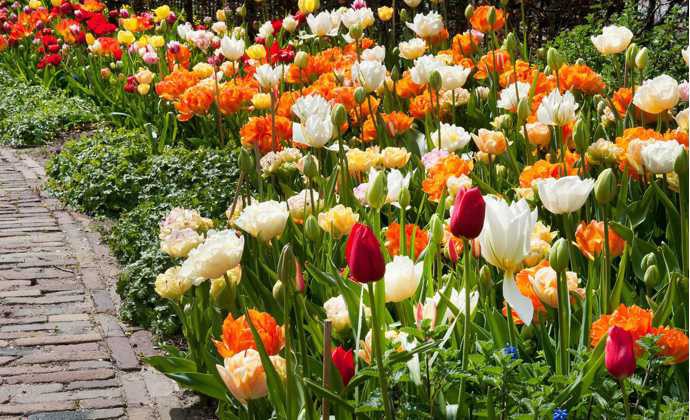 Eine wunderbare Farbenpracht. Bei einer ähnlichen Bepflanzung müssen die Zwiebeln optimal aufgeblasen werden. Bei einer spärlichen Bepflanzung könnte der daraus resultierende Effekt den Charme des dichten bunten Wuchses verlieren.