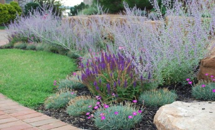 In diesem Beet gibt es nur drei Arten von Stauden, wobei die winterharte Perovskia die Hauptrolle spielt. Wenn sie schwach und weniger verzweigt erscheint, können Sie sie im Frühjahr auf 5-10 cm zurückschneiden. Sie ist eine ausgezeichnete Staude, die viele Schmetterlinge und Bienen in den Garten lockt.