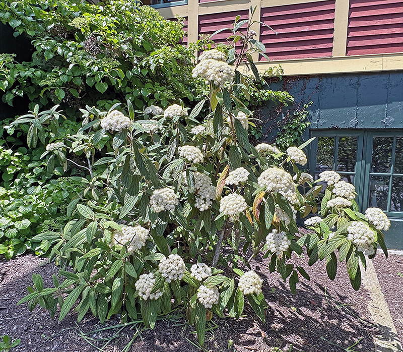 Es handelt sich um einen immergrünen, ausladenden Strauch mit großen, glänzenden, grünen und stark faltigen Blättern. Diese sind eiförmig und auf der Unterseite stark geädert und gefilzt. Die Blüten sind gelblich und blühen in filzigen, flachen Spitzen. Die Blütezeit erstreckt sich von Mitte Mai bis Juni. Die Frucht ist eine kleine rote Steinfrucht, die im Herbst reift und sich schwarz verfärbt.