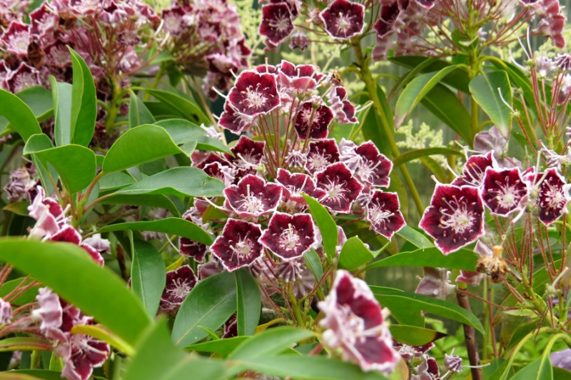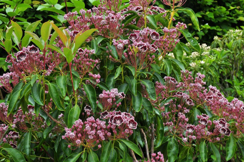 Haben auch Sie eine Schwäche für etwas, das andere wenig oder gar nicht kennen? Wir haben die breitblättrige Calmia unter unsere Fittiche genommen. Dieser Heidekrautstrauch ist einer der schönsten blühenden immergrünen Sträucher unseres Klimas. Er ist im Südosten der USA und in höheren Lagen Asiens beheimatet, wo er als üppiger Unterwuchs höherer Bäume zu finden ist. Es gibt bereits viele Kultivare mit verschiedenen Kombinationen aus roter, weißer, rosa oder weinroter Farbe. Das Beeindruckendste an der Blüte selbst ist jedoch, wenn die Blütenbüschel noch halb in der Knospe stehen, die in der Regel eine andere Farbe als die Blüten selbst hat. Sie blüht gegen Ende Mai bis Juni und verlängert damit die Frühjahrsblüte von Heidebeeten mit Rhododendren und Azaleen.