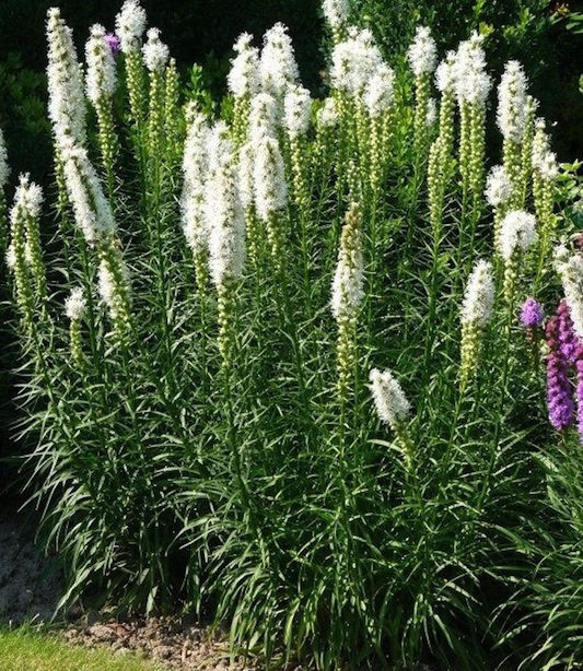 Liatria White ist eine höher wachsende Sorte (70-80 cm) mit weißen Blüten. Sie ist eine anspruchslose Staude, die eine interessante vertikale Struktur in der Bepflanzung bildet. Ihre untypischen Blüten ziehen die Blicke von Staudenliebhabern und Fluginsekten auf sich. Sie eignet sich für die Bepflanzung von verschiedenen Stauden- und Staudengrasbeeten. Der Standort sollte sonnig sein mit gut durchlässigen Böden.
