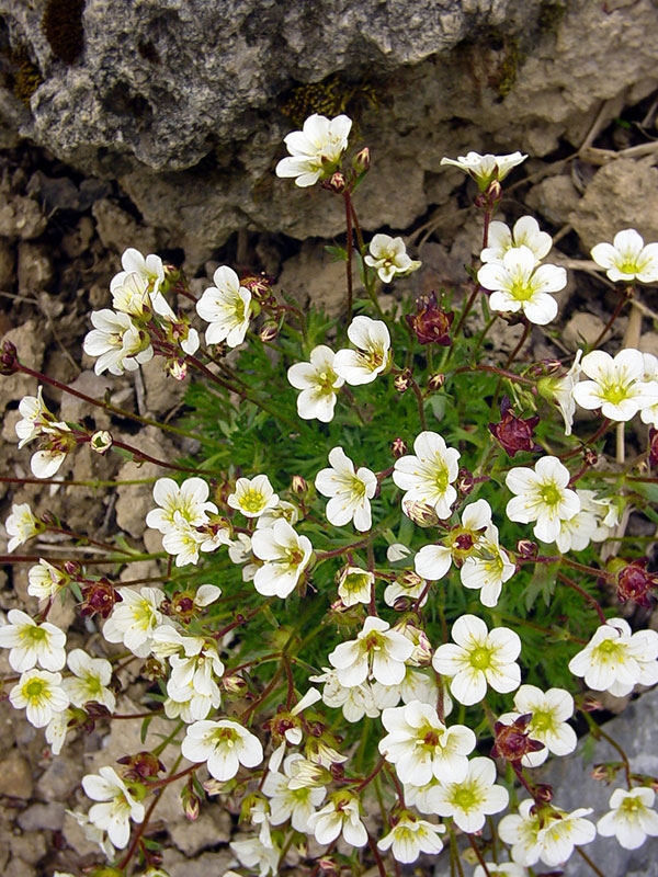 Blütenfarbe: weiß Blattfarbe: grün Pflanzentyp: Steingarten Bildet dichte Polster, aus winzigen Blattrosetten.