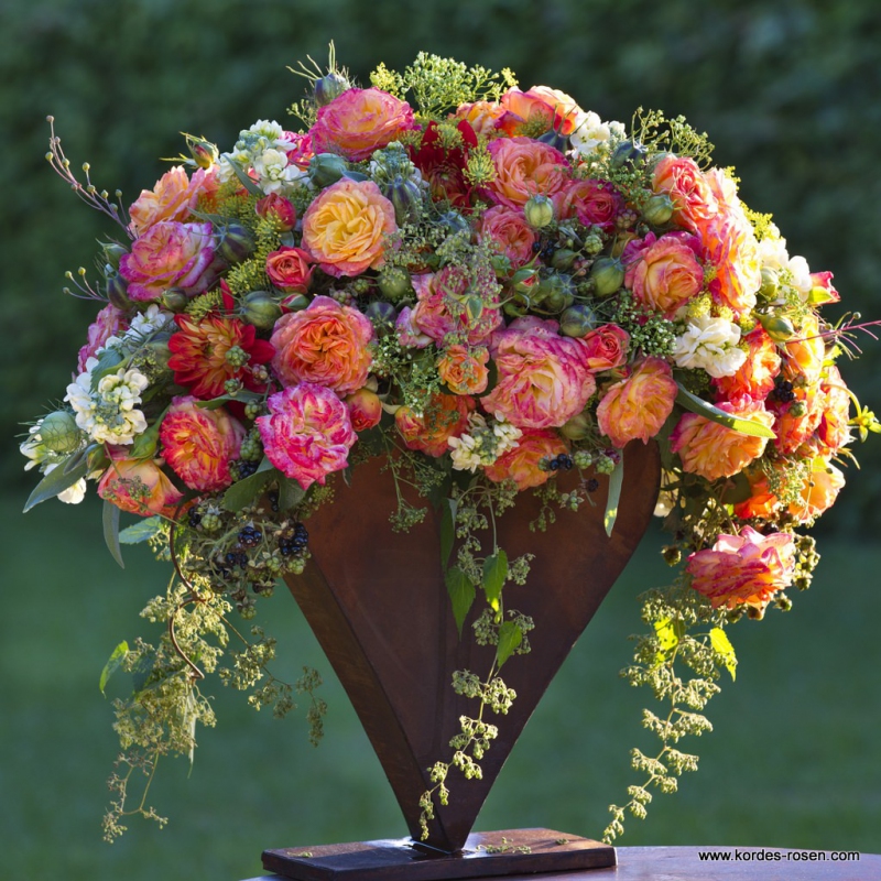 Diese Floribunda ist ein wahrer Schatz in der Landschaft, mit viel Farbe und sehr gesundem Laub. Die hochkonzentrierten Knospen öffnen sich zu einem gefüllten Blütenbecher, dessen gelbe Mitte von intensiv roten Rändern umgeben ist. Sie hat mehrere Preise gewonnen, darunter den City of Adelaide Award, den Peoples Choice Award und den City of Glasgow Gold Award.