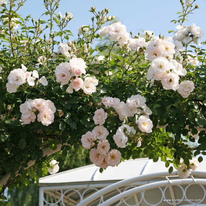 Hella ist eine sehr wüchsige und blütenreiche Kletterpflanze, deren reinweiße, leicht duftende Blüten in der Mitte goldgelbe Staubgefäße haben. Ihre langen und biegsamen Zweige können bis zu 3 m hoch werden, was diese Kletterrose ideal für Wände und Pergolen macht.