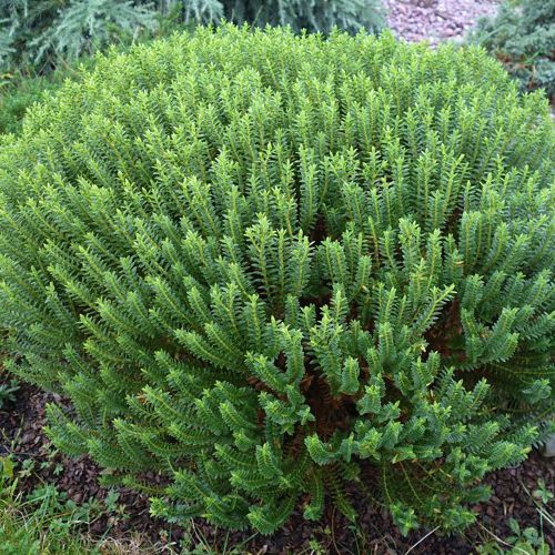 Die Hebe New Zealand Gold zeichnet sich durch grüne, kleine Blätter aus, die alle Triebe dicht bedecken.
